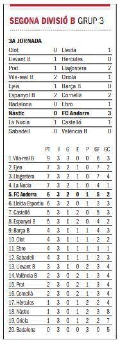 A la represa, els locals, obligats després de sumar només un punt de sis possibles, van arrencar millor, però no generaven cap perill, i va ser, de nou, l’FC Andorra el que va avisar amb un xut potent de Forgas al travesser després d’una gran jugada individual de Moha Keita, mentre que el Nàstic va tenir més arribades, però sense tenir cap ocasió clara ni inquietar Nico Ratti. El duel semblava força decantat pels tricolors, i encara ho va estar més quan a l’equador de la segona meitat Javier Bonilla va veure una vermella directa després d’una entrada sobre Bover. Conscients que era el Nàstic el que havia d’anar a buscar la victòria, els tricolors van administrar bé la diferència i van optar per fer una petita passa enrere i sortir a la contra per acabar de tancar el partit. I dit i fet. Brugui, pels locals, va tenir un xut que va atrapar Ratti sense problemes, i l’FC Andorra va acabar de sentenciar el matx a la contra amb dues accions. Primer Pachón va aprofitar una pilota que va caure rebotada dins de l’àrea per fer el 0-2, i ja al temps afegit, Rubén Bover va culminar un contraatac per anotar el 0-3 definitiu. I el marcador encara hauria pogut ser més contundent, ja que entre els dos gols, els homes de Gabri van aprofitar un cinc contra dos amb la defensa grana. Els tricolors, amb la victòria d’ahir, se situen en cinquena posició a la taula amb sis punts després de tres partits, i la setmana que ve rebran l’Ejea aragonès, segon classificat. En una jornada quasi rodona, l’única notícia negativa va portar el nom del capità, Fede Bessone, que va haver de deixar el camp a la primera meitat a causa d’una lesió.
