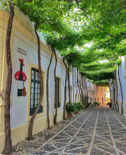 Carrer ciegos Situat dins del complex cellerer de Tío Pepe (González Byass) és un dels racons més icònics de la ciutat. Està ple d’edificis de planta baixa i parets emblanquinades i cobert per un enorme emparrat que fa un bonic efecte de llums i ombres.