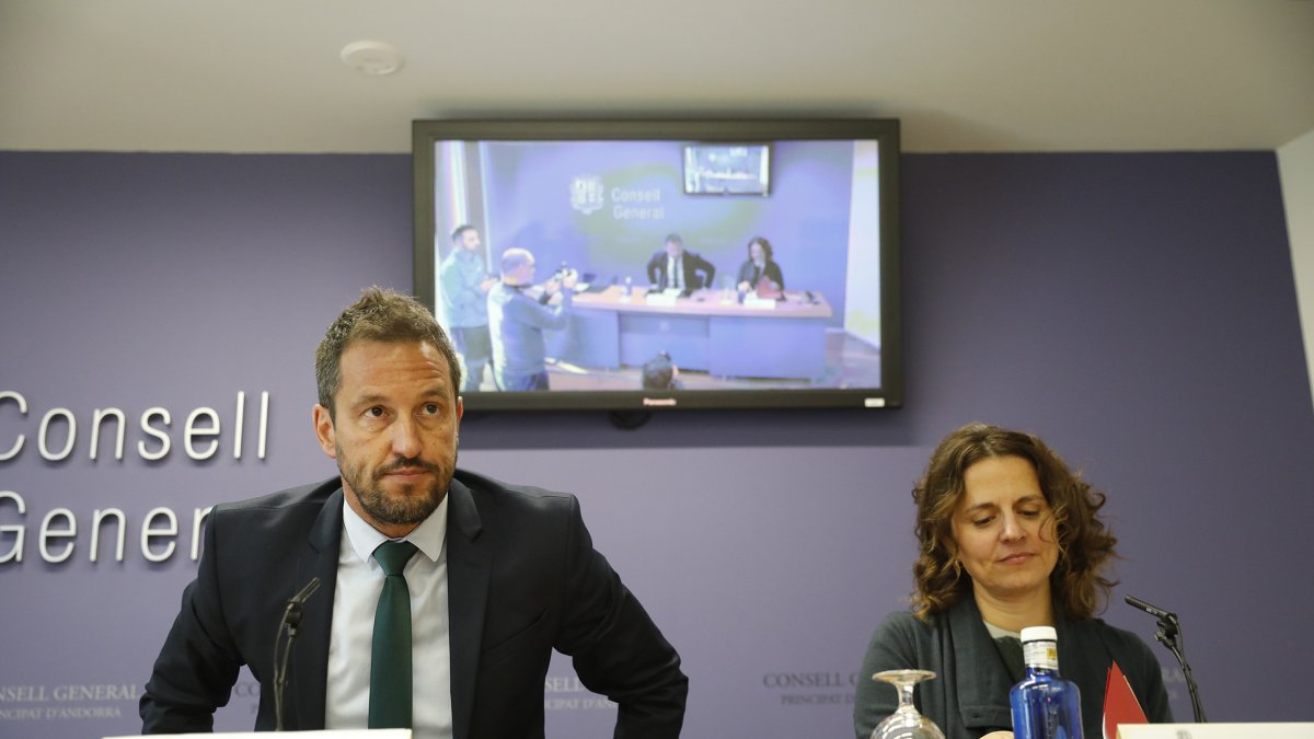 Pere López i Rosa Gili, durant la roda de premsa d'ahir al Consell General.