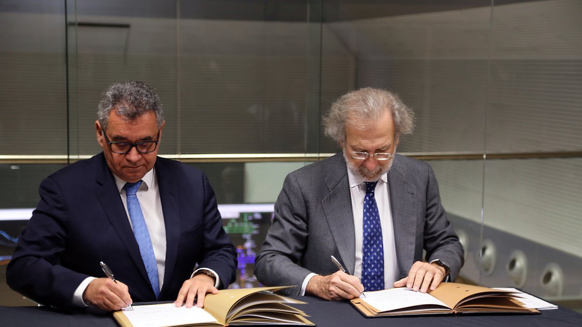 El director general de FEDA, Albert Moles, i el president d'Endesa Energia, Javier Uriarte, han signat un contracte perquè la parapública andorrana obtingui energia solar i eòlica durant deu anys