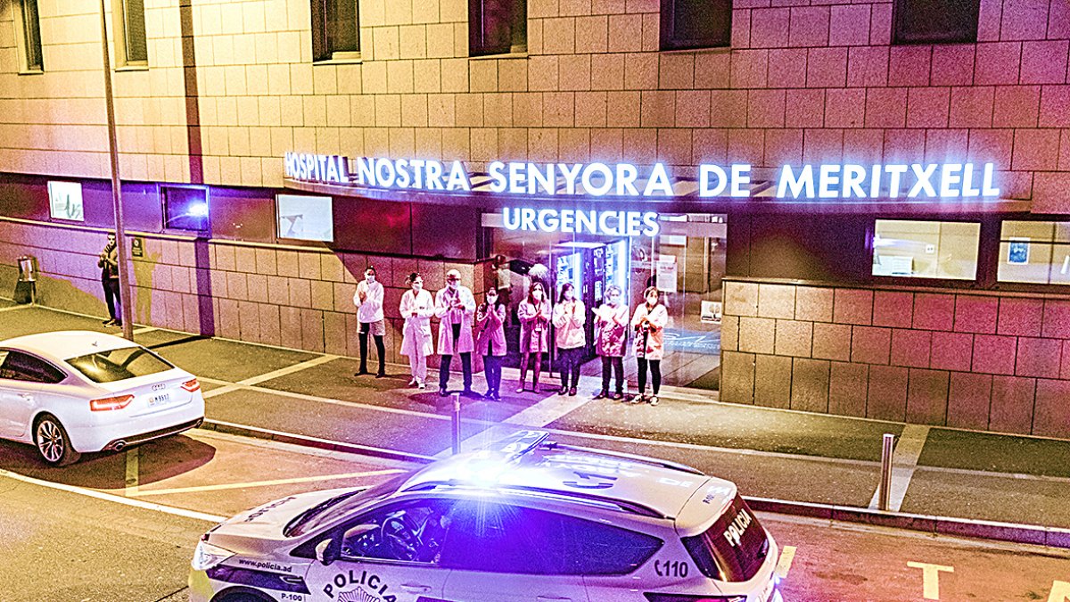 Una quinzena de vehicles de policia, bombers i agents de circulació van fer sonar les sirenes ahir a la porta d’urgències de l’hospital Nostra Senyora de Meritxell en reconeixement als professionals de la salut. Els efectius van baixar dels cotxes a les 20 hores per aplaudir-los, i alguns dels sanitaris van sortir de l’edifici a agrair el gest i a aplaudir els cossos de seguretat.