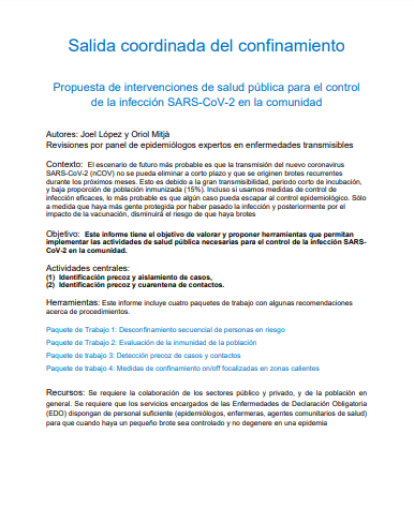 El pla d'aixecament de mesures de restricció de la mobilitat signat per Oriol Mitjà i Joel López fixa que la primera obertura autoritzada seria la dels negocis de serveis considerats no bàsics, el segon sector seria l'hoteleria, després deixaria d'estar vigent la recomanació de quedar-se a casa per a persones de menys de 70 anys i la quarta mesura serà reobrir els centres escolars. La següent fase comporta permetre sortir la part de població de més de 70 anys i finalment s'autoritza celebrar esdeveniments que apleguin més de mig centenar d'assistents.