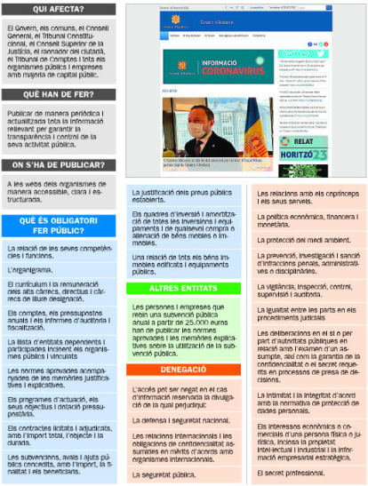 Els tot just 24 articles i les disposicions transitòries i finals de la llei obligaran les administracions a despullar-se i mostrar part de les seves entranyes. Salaris i currículums dels càrrecs i assessors, pressupostos, contractes, subvencions i ajuts, inversions i quadres d’amortització... Gran part de la informació econòmica del Govern, els comuns i les institucions haurà d’estar penjada a la pàgina web, si prospera la proposició en els seus actuals termes. La Llei no baixa tant al detall com la de països amb molta més tradició en matèria de transparència, però representa un salt qualitatiu per a l’administració andorrana, poc generosa amb la informació que genera.