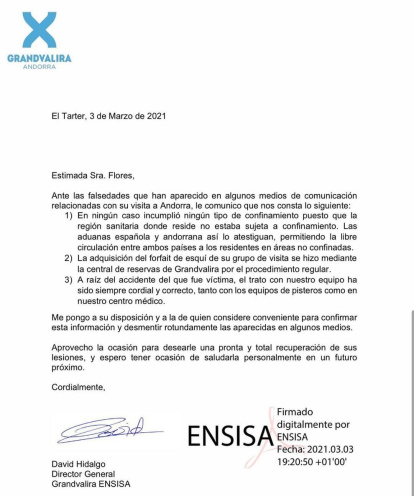 La model i presentadora espanyola Mar Flores va compartir ahir a través de les xarxes socials una carta escrita pel director general de Grandvalira-Ensisa, David Hidalgo, on defensa Flores i desmenteix algunes de les informacions que s'ha difós en els darrers dies a causa del seu accident al Tarter a finals de febrer. El text explica que la model no es va saltar cap restricció de mobilitat per fer la seva visita a Andorra, ja que "la regió sanitària on resideix no estàsubjectea cap confinament", que la compra del forfet del seu grup es va produir "a través de la central de reserves de Grandvalira pel procediment habitual" i que el tracte delspistersi del centre mèdic va ser "cordial i correcte". Hidalgotambéaprofita l'escrit per desitjar-li una bona recuperació i assegura que es posa a disposició per a confirmar aquesta informació i desmentir aquelles que han aparegut en els mitjans.