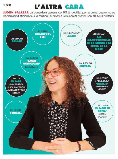 La consellera general del PS té debilitat per la cuina casolana, es declara molt aficionada a la música i al cinema i els indrets marins són els seus preferits
