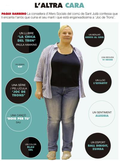 Paqui Barbero La consellera d’Afers Socials del comú de Sant Julià confessa que li encanta l’arròs que cuina el seu marit i que està enganxadíssima a ‘Joc de Trons’.