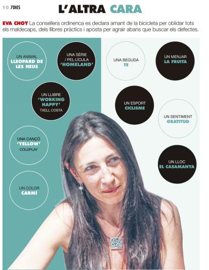 Eva Choy. La consellera ordinenca es declara amant de la bicicleta per oblidar tots els maldecaps, dels llibres pràctics i aposta per agrair abans que buscar els defectes