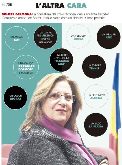 Dolors Carmona. La consellera del PS+I reconeix que li encanta escoltar 'Paraules d'amor', de Serrat, i tria la platja com un dels seus llocs preferits