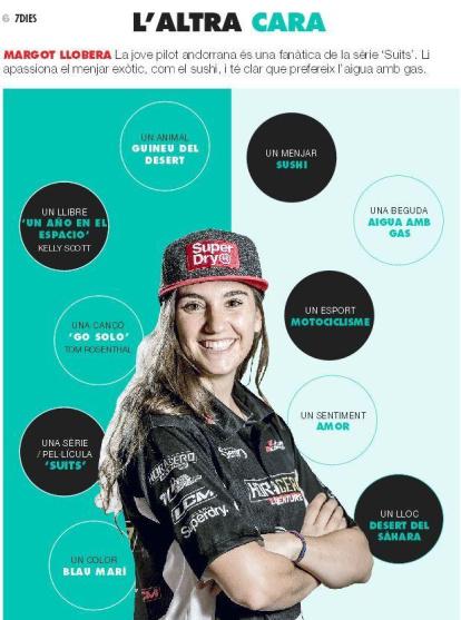 La jove pilot andorrana és una fanàtica de la sèrie ‘Suits’. Li apassiona el menjar exòtic, com el sushi, i té clar que prefereix l’aigua amb gas.