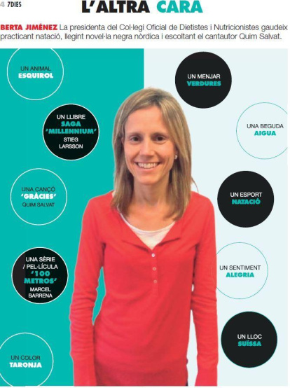 La presidenta del Col·legi Oficial de Dietistes i Nutricionistes gaudeix practicant natació, llegint novel·la negra nòrdica i escoltant el cantautor Quim Salvat.