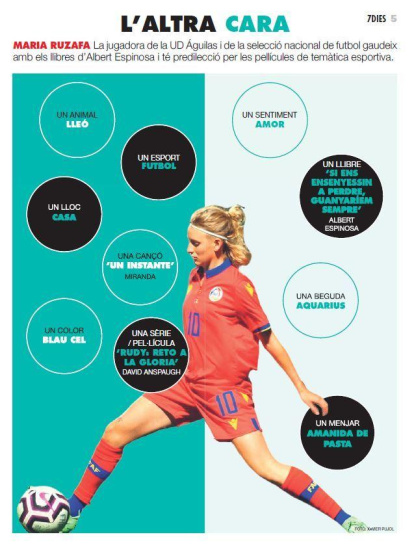 La jugadora de la UD Águilas i de la selecció nacional de futbol gaudeix amb els llibres d’Albert Espinosa i té predilecció per les pel·lícules de temàtica esportiva.