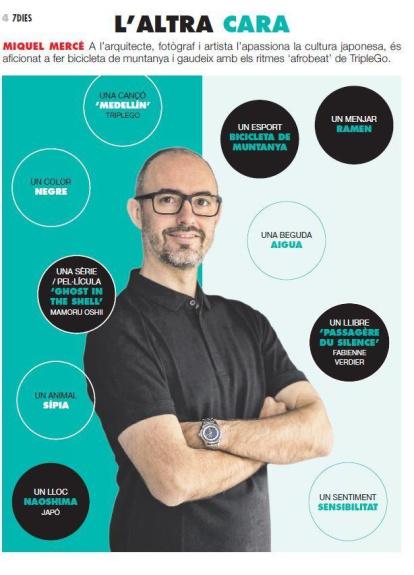 A l’arquitecte, fotògraf i artista l’apassiona la cultura japonesa, és aficionat a fer bicicleta de muntanya i gaudeix amb els ritmes ‘afrobeat’ de TripleGo.